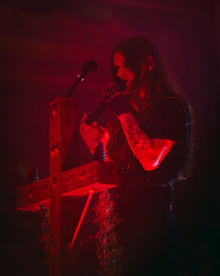 Pokud se totiž na prvním českém koncertě Ethel Cain něco potvrdilo, tak její schopnost strhnout pozornost směrem k hudbě samotné a všem jejím prezentovaným vrstvám – na pódiu se vyjma světelných a kouřových efektů neděly žádné skopičiny, také promluvy k publiku byly velmi úsporné; protagonistka víceméně staticky pěla za křížem, někdy před ním a párkrát si sedla.