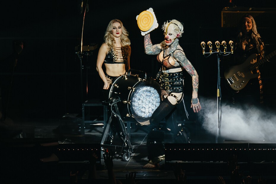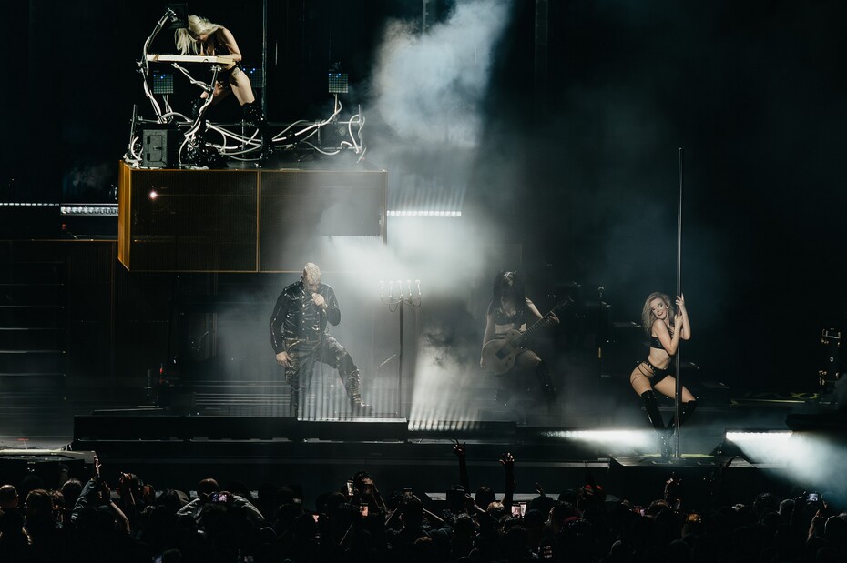 Scéna. Poměrně nezajímavá, zpestřená jen dvěma velmi spoře oděnými ženštinami, většinou se kroutícími na okrajích v koutech pódia. Jejich královská chvíle přišla zhruba ve svou třetinách koncertu, kdy z připraveného stolu braly jeden po druhém dorty a s gustem je vrhaly do publika. Lindemann se také chvíli pohyboval po hlavách publika ve velké plastové bublině, ale jinak toho tropil méně, než co pamatujeme z Letňan.