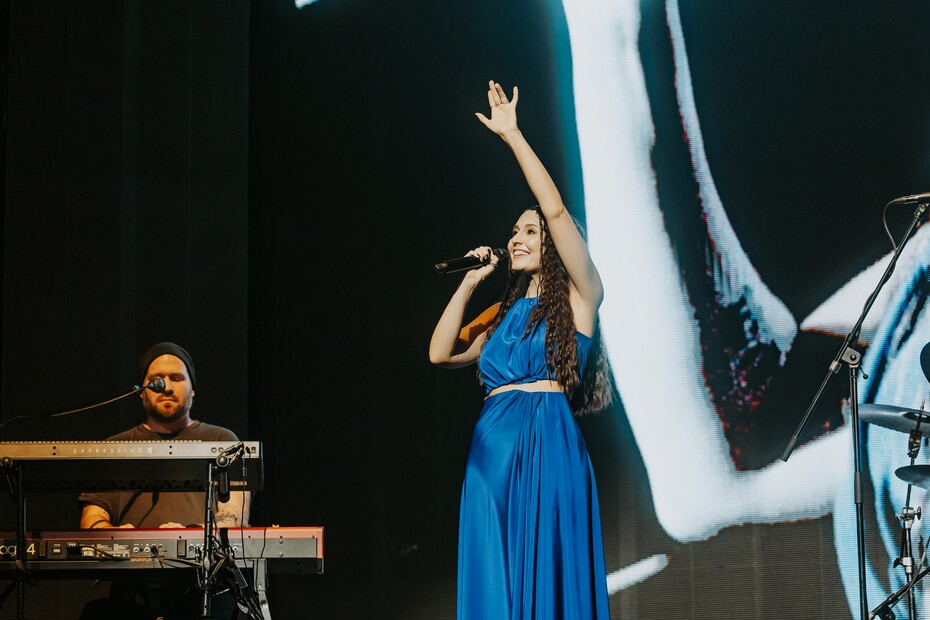 V druhé půlce se sestava, už zpátky na hlavní scéně, rozšířila ještě o tříčlennou dechovou sekci a vokalistky, zatímco Tichá zůstala sama na ostrůvku. V tomto bodě chvilku trvalo, než si sednul zvuk, zpočátku se totiž hlavní vokální linka mezi novými nástroji a hlasy trošku ztrácela. Pak už se zpěvačka vrátila zpátky ke kapele, tentokrát za plného světla a přímo skrz publikum vyprodané haly. V základním setu nechyběly skladby jako ohnivé Pravé poledne, hitový Plamen, Ta třetí se skvělým trumpetovým motivem nebo Divoká, kde bylo divoké hlavně prodloužené Matoušovo kytarové sólo a ještě divočejší Marovy taneční kreace. V několika písních se ke kapele připojil i její častý host akordeonista Michal Mihok, víc speciálních hostů si ale Tichá nezvala, i když repertoár společných skladeb by na to měla (namátkou Cais, Kozub, Vesna). A je to jen dobře, takhle její první velký koncert nebyl roztříštěn uváděním rozličných cizích elementů, ale držel si fokus na Kateřině, jejích vynikajících vokálech a výborných instrumentalistech z Bandjeez.