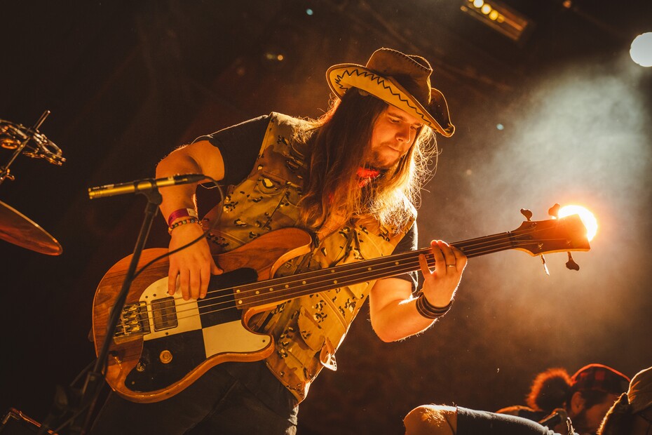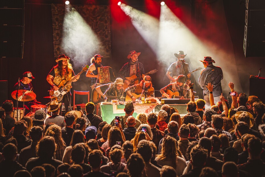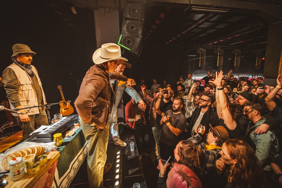 Po projekci kapela vlítla na pódium s energií, která by vystačila na víkendový festival. Otevírák „Rovnou jo tady rovnou“ okamžitě zvedl dav, následoval „Spacák v kanclu“ a „Buřtík v srdci“, a publikum bylo definitivně v jejich moci. V setu zaznělo snad všechno, co kdy nahráli včetně „Kdybych se narodil v Brně“, kterou s nimi před časem nazpíval americký singer-songwriter Joshua Magee. A právě Joshua se stal hvězdou večera – nejprve si střihl pár skladeb s kapelou, poté několik vlastních, čímž proměnil MeetFactory v autentický country salón.